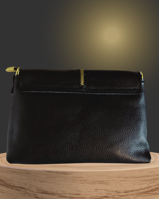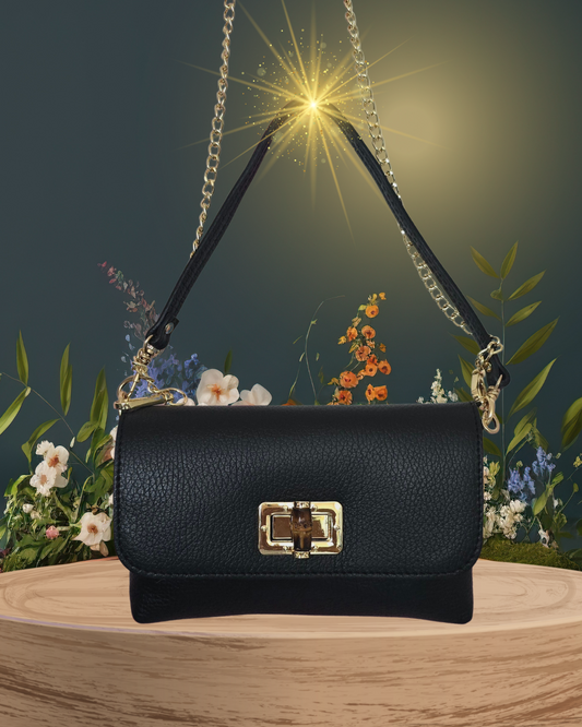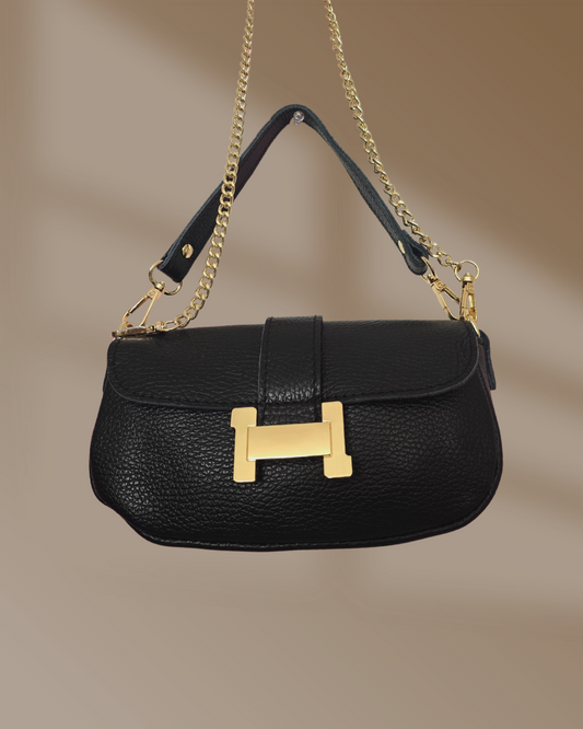 Zwarte leren schoudertas/crossbodybag met gouden ketting hengsel.