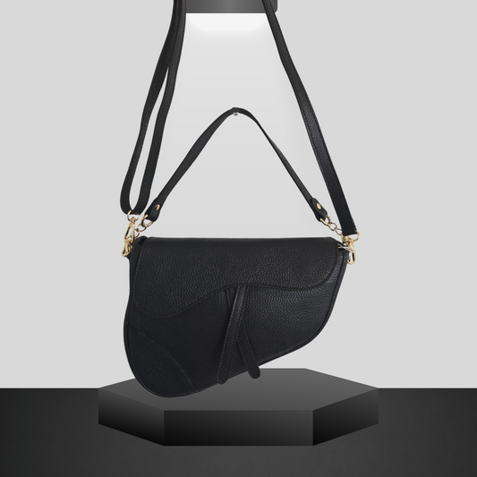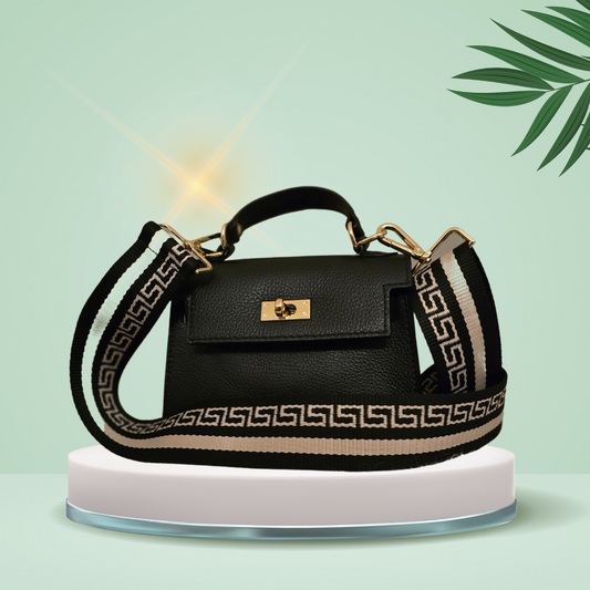 Zwarte leren Crossbody handtas met goudkleurige draaisluiting.