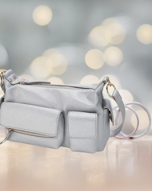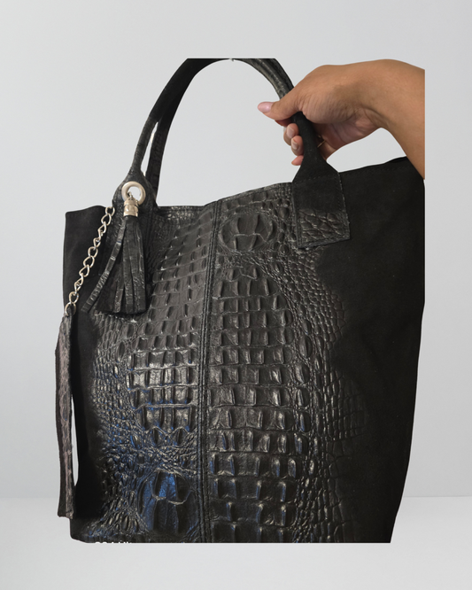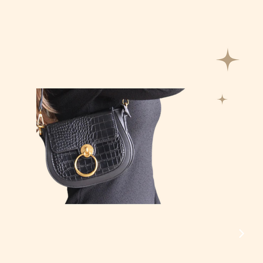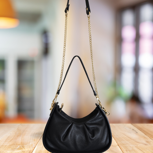 Zwarte leren schoudertas/crossbodybag met gouden ketting hengsel.