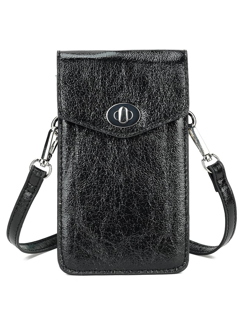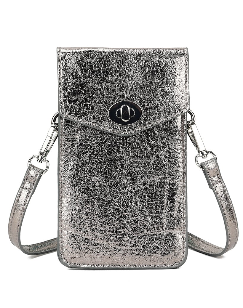 Kunstlederen metallic telefoontasje met een druksluiting.