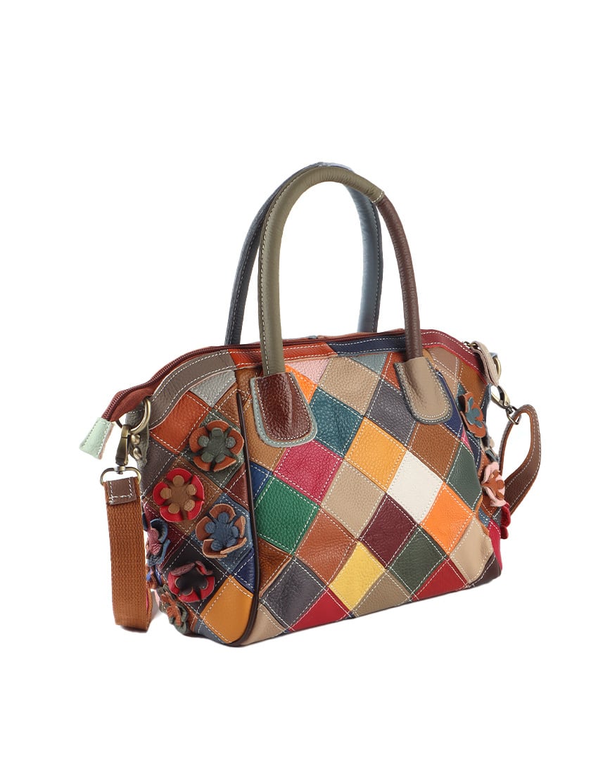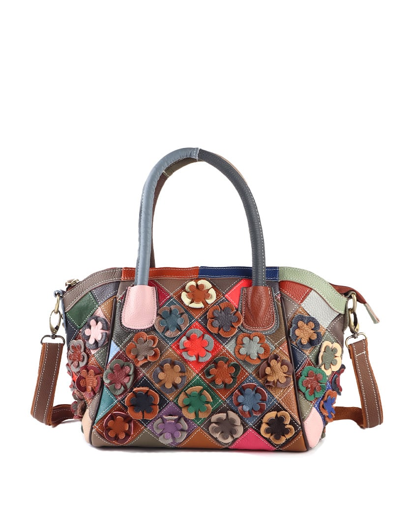 Lederen multi colour gebloemde handtas met een rits. met rits. De tas heeft een afneembare schouderband. Aan de binnen kant zijn twee afzonderlijke vakken, en meerdere vakjes.