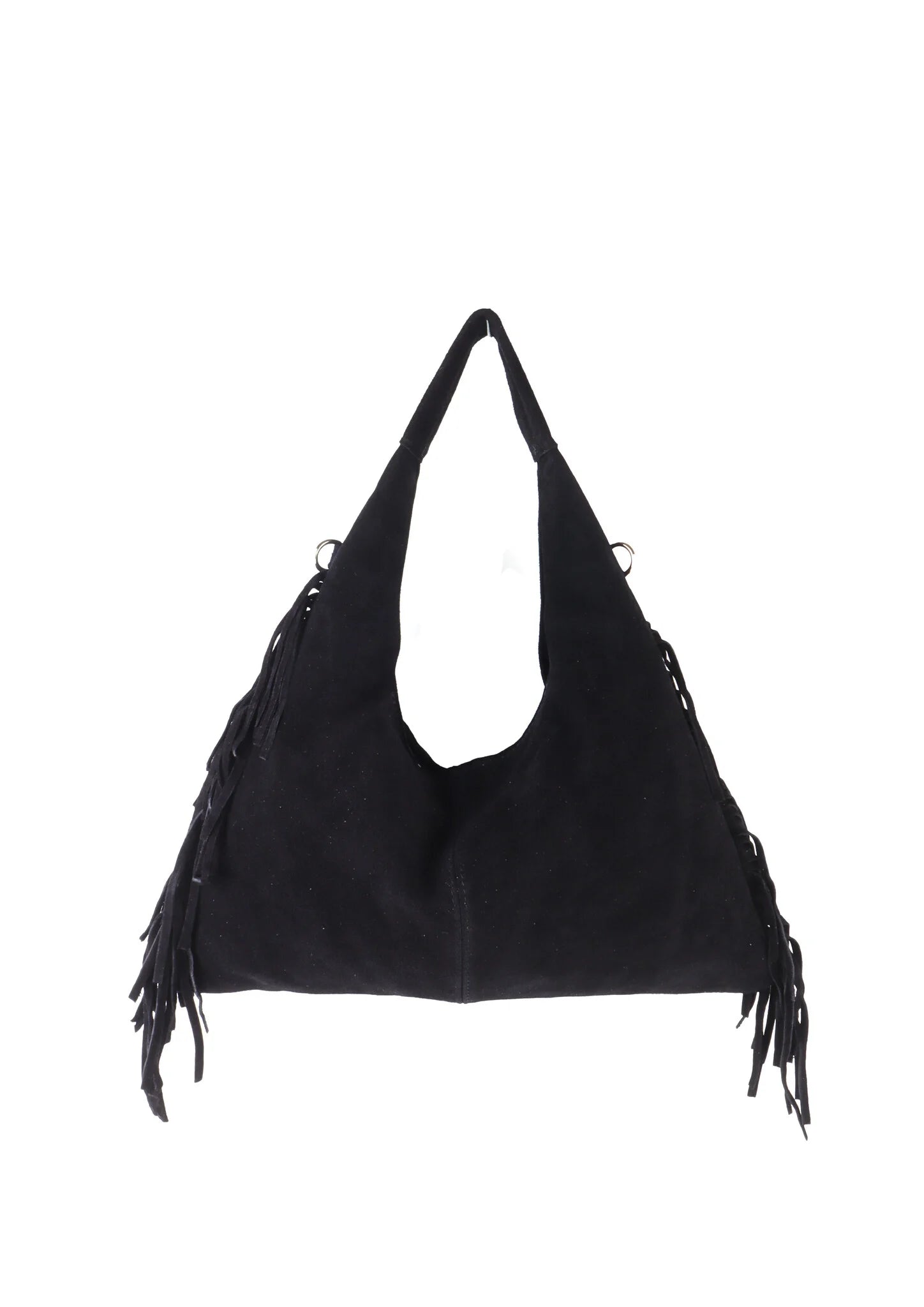 Trendy suède schoudertas in een diepe koffiebrown kleur met een stijlvolle boho-uitstraling. De tas is voorzien van speelse franjes aan de zijkanten, een comfortabele schouderband en een praktische ritssluiting.